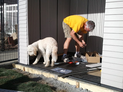 Mom said we had to put a cement pad under the Doodle Clubhouse because last year we kept digging holes and making it all muddy. We love our Clubhouse and go in there all the time when we're playing in the yard (our pawrents hardly ever close the door). Mom said she hates where we had to put it but we live on the foothills and our yard slopes in 2 directions and this was the only flat spot. And Dad needed that shed REAL bad, especially since he bought Bubba (the giant snow-blower) this past winter. Now mom says we have to fix all the landscaping that got destroyed. Oh, now THAT is going to be a BIG project for sure!